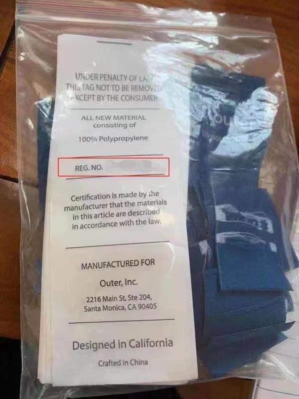 除了URN注册号,美国部分州的州政府要求在该州销售的床上羽绒制品(被子,枕头,床垫等)和二手床上用品,在产品上附上有标注该州政府特定机构颁发的消毒许可证号码(Sterilization Permit)的标签,否则不得上架销售。